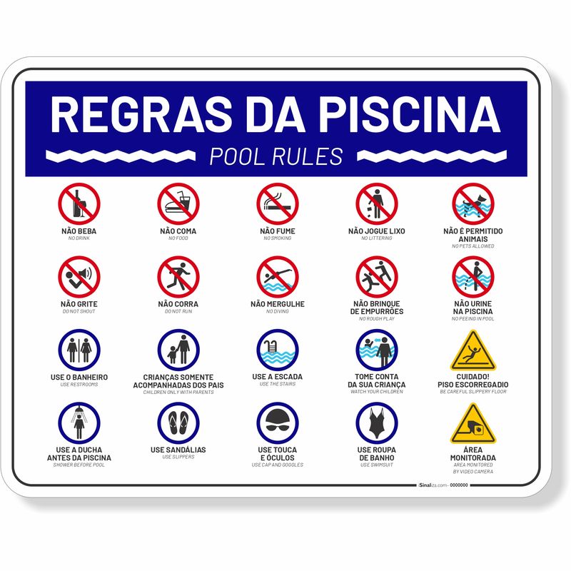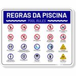 Placa de Regras da Piscina: Sinalização essencial com pictogramas ISO e texto bilingue. Indica proibições (não beber, comer, fumar, animais, etc.), ações a evitar (gritar, correr, mergulhar sem cuidado), normas de higiene (usar banheiro, ducha, não urinar), segurança infantil (acompanhamento dos pais) e uso adequado (escada, vestimentas). Alerta para piso escorregadio e informa sobre monitoramento por vídeo. Conforme NBR 13434.