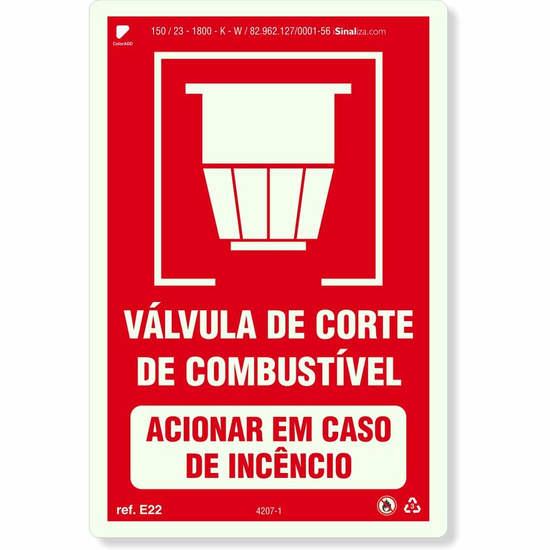 A placa fotoluminescente "Válvula De Corte De Combustível Fotoluminescente E22”, é fabricada em PVC fotoluminescente com 2 mm de espessura e superfície antiestática. A placa indica a direção de saída de emergência, sendo ideal para ambientes com ou sem incidência de luz. A placa não contribui para a propagação de chamas quando submetida à ação de fogo, sendo classificada como “Retardador” em conformidade com a Norma IEC 60092-01:2002.